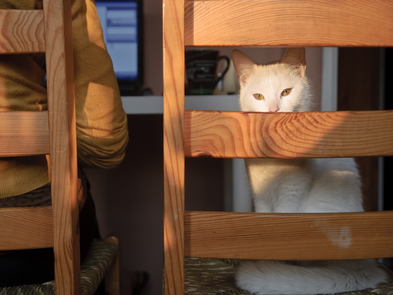 W domu opanowanym przez kota często okazuje się, że kluczowe miejsce siedzące jest już zajęte. Zachęcanie kota do zmiany lokalizacji zazwyczaj jest jałowe, więc pozostaje nam dostawić sobie krzesło albo pracować na stojąco.